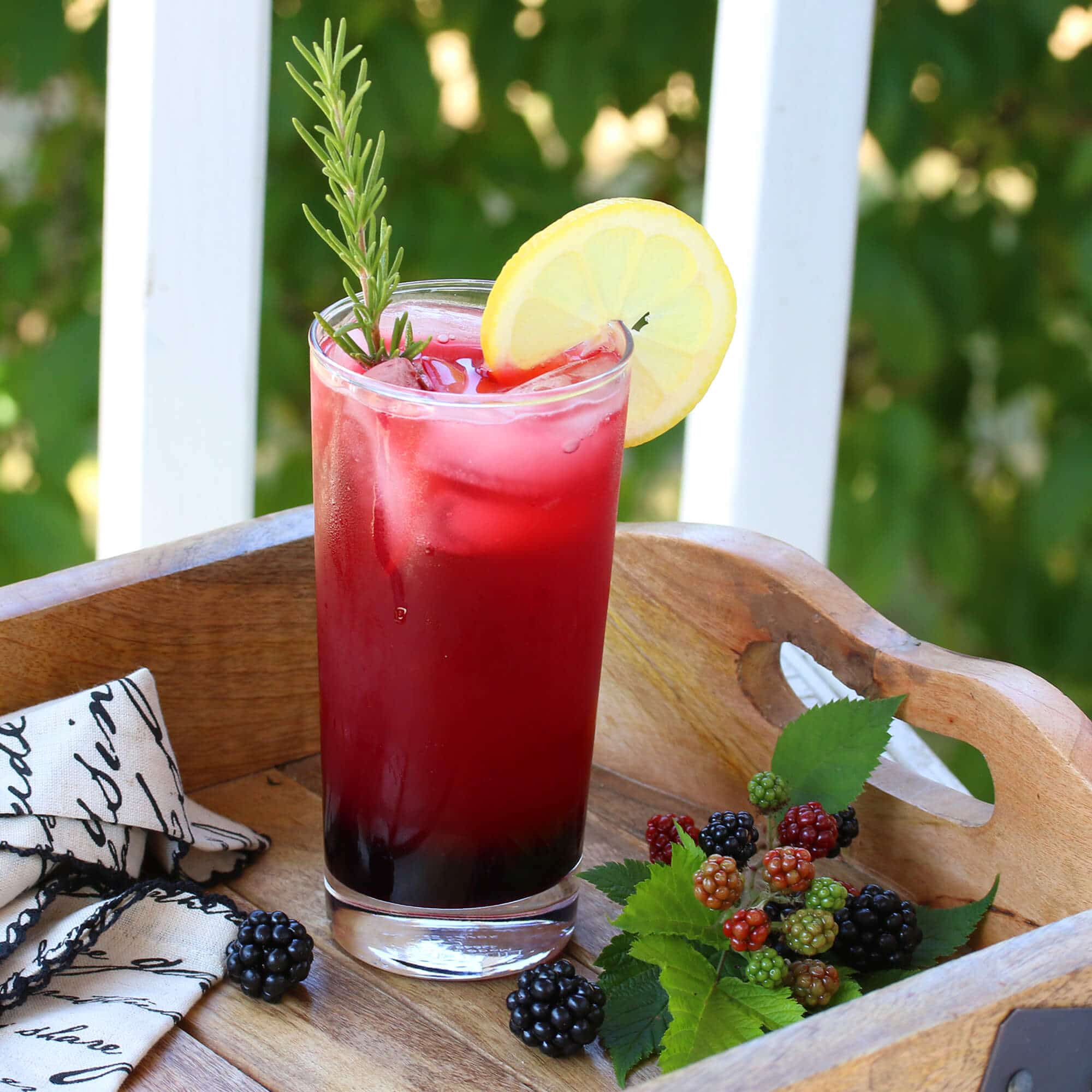- Add the lemon juice, blackberry syrup, ice cubes and remaining seltzer. ย Give it a stir. ย Garnish with a slice of lemon and sprig of fresh rosemary.