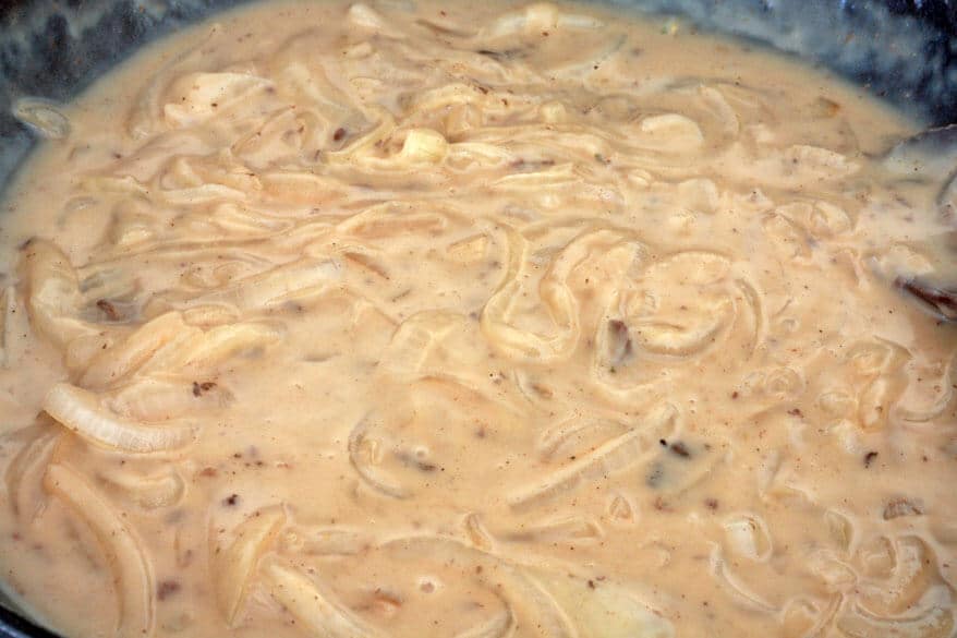 Add the beef broth and milk, stirring constantly to prevent lumps. ย Increase the heat and bring it to a boil, deglazing the bottom of the pan, scraping upย any browned bits.
