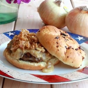 Creamy sweet onion gravy smothered over a chicken fried steak burger patty, topped with crispy French fried onions and sandwiched between two toasted onion rolls. ย The ultimate “comfort burger”!