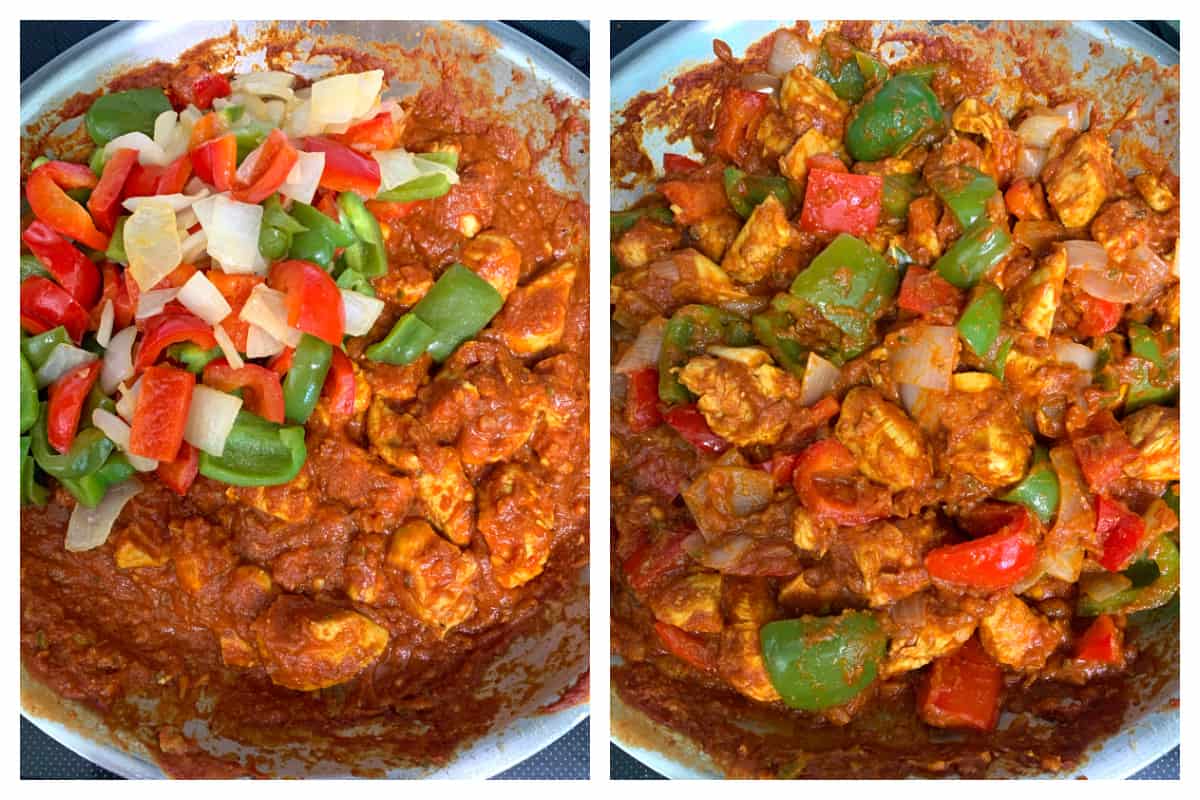 - Heat the oil or ghee in a skillet and fry the roughly chopped onions and bell peppers until softened but still have some crisp.ย Transfer them to a bowl and set aside.In the same skillet, add a little more oil and ghee and cook the finely diced onions until golden.ย Add the jalapeno pepper, garlic, and ginger and cook for another minute or two. Add the spices and cook for another minute. Add the chicken and cook until the chicken turns white but is not cooked through. Add the tomato puree, tomato paste, bay leaf, salt and pepper and stir to combine. Bring it to a low simmer, cover and simmer for 20 minutes, stirring occasionally.Return the onions and bell peppers to the skillet and stir to combine. Simmer for another 3-4 minutes. Add salt and pepper to taste. If the mixture is too dry add a little bit of water (note that Chicken Jalfrezi is not a "saucy" dish). Serve with steamed rice and/or naan or sourdough naan and some refreshing cucumber raita.