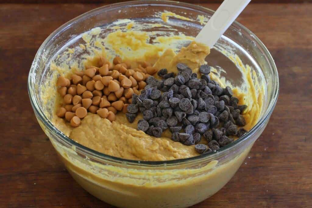 • Fold the flour mixture into the wet mixture with a rubber spatula just until combined (a few lumps are okay) being careful not to over-stir. The batter will be thick. Stir in the chocolate and butterscotch chips.