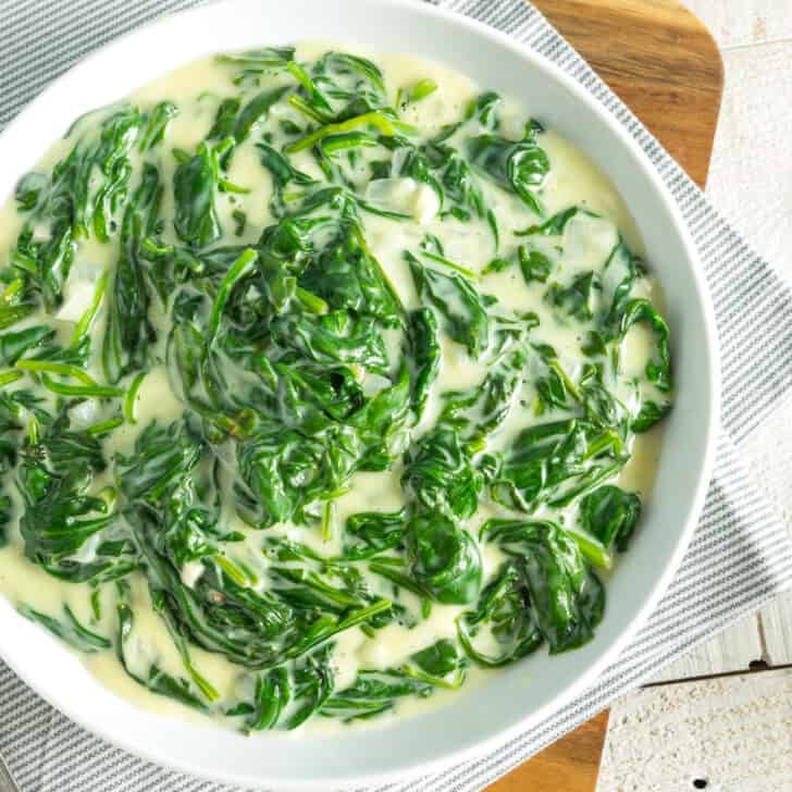 This Creamed Spinach recipe includes cream cheese and Parmesan for added richness and flavor. Luxuriously creamy and irresistibly yummy, it is a delicious and versatile side dish that pairs beautifully with a wide variety of mains!