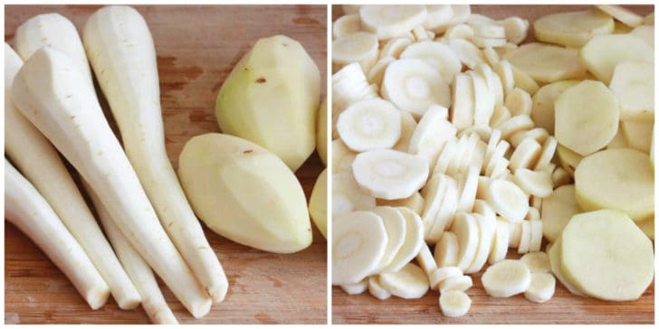 Peel the parsnips and potatoes.