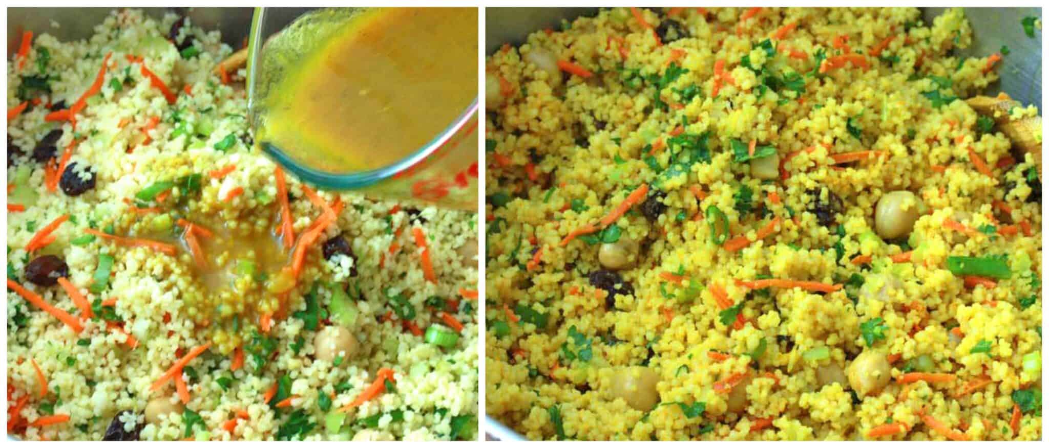 - Add all veggies, parsley, garbanzo beans, raisins/currants and preserved lemon to the couscous and stir to combine. To prepare the dressing, combine all the ingredients in a mixing bowl and whisk until emulsified.Pour the dressing over the couscous salad, 1/3 at a time, stirring to combine between additions. Cover and refrigerate overnight so the flavors have time to meld. Because of the vinegar/acid content, use a glass or plastic bowl.Serve as a light main course or as a side dish along with chicken, pork, fish, etc.Will keep for 4-5 days in the fridge.