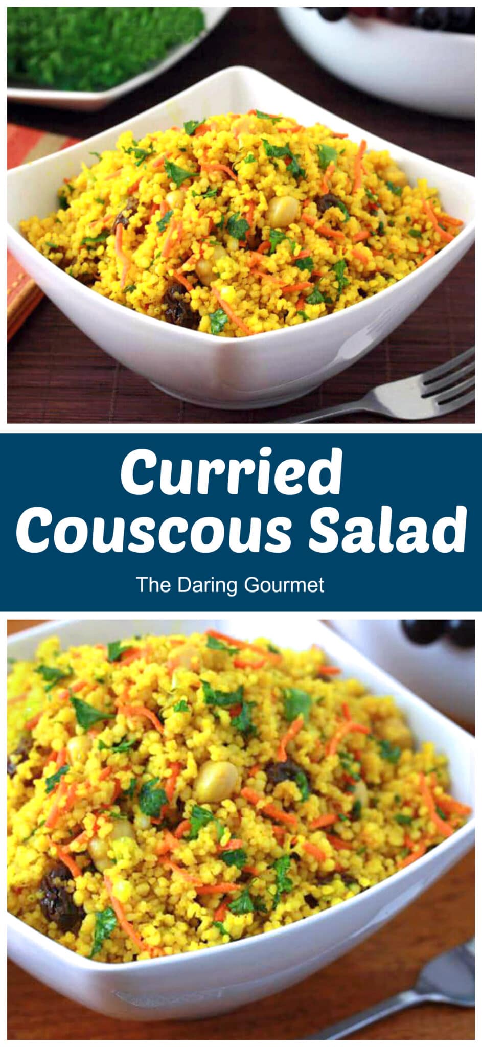 The contrasting flavors and textures in this curried couscous salad are sure to win you over.ย Crispy carrots and plump chewy raisins mingle with buttery garbanzo beans, tender couscous, and a lemony honey-curry vinaigrette that’s simply heavenly.