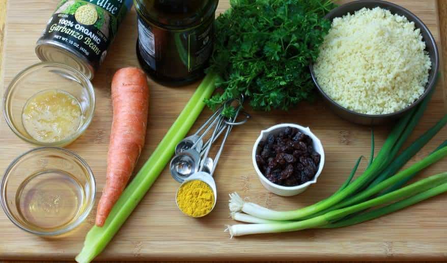 A ton of healthy ingredients go into this salad: ย Garbanzo beans, carrots, celery, parsley, green onions, extra virgin olive oil, vinegar, honey, raisins (orย zante currants if you prefer, they’re smaller – or you can use dried cherries or cranberries), curry powder, and turmeric.ย And if you want to bump up the health factor you can even substitute quinoa or millet for the couscous.