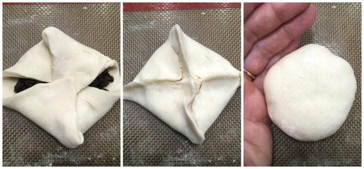 Fold each corner in towards the center and then gently press the edges to seal them. Bend the bend the corners in towards the center to create a round shape. Turn the pastry over with the sealed edges on the bottom and further shape it into a round.