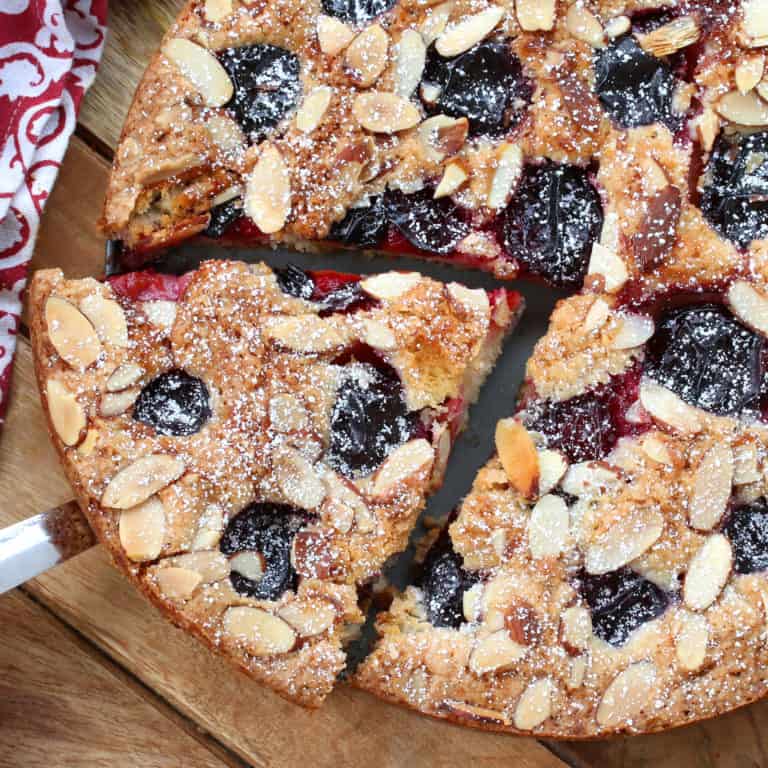 This delicious rustic-elegant French Almond Plum Cake recipe features a delightfully delicate crumb infused with the flavor of almonds and juicy plums. It’s easy to make, works equally well with apricots or cherries, and is a guaranteed hit wherever you serve it!