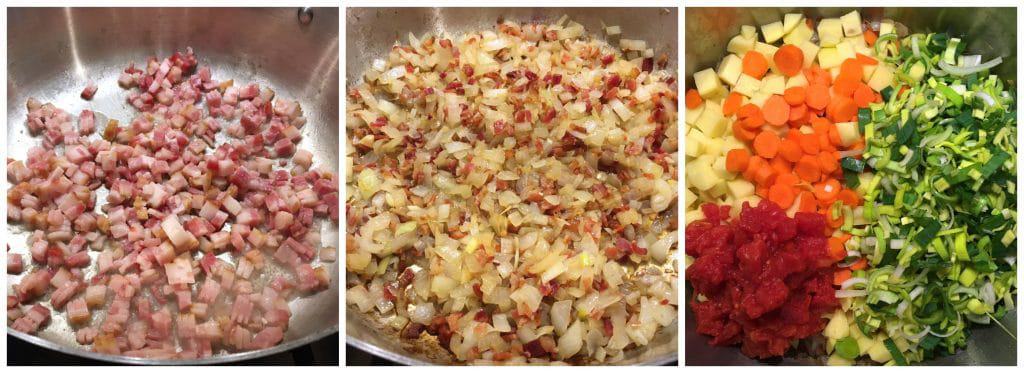 Fry the bacon, then add the onions and cook until golden, 6-8 minutes. Add the garlic and cook for another minute. Add the vegetables.