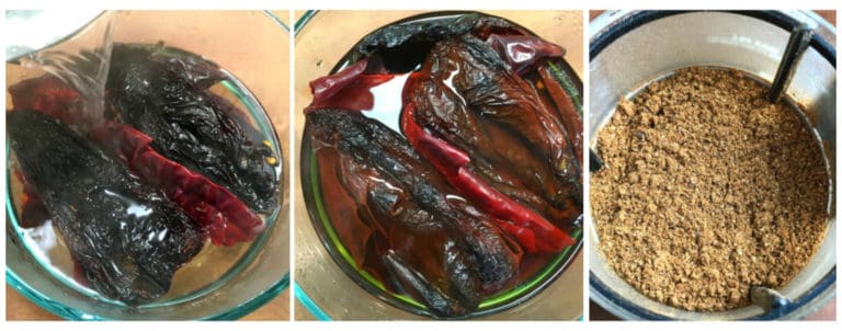 While the chilies are soaking heat a small skillet over medium heat and toast the caraway, coriander, and cumin seeds, frequently stirring them, until very fragrant, about 4-5 minutes. Be careful not to scorch them or they will be bitter. Let the spices cool completely and then transfer them to a spice or coffee grinder and grind them to a fine powder. I’ve been using my KRUPS coffee/spice grinder for over 10 years and it’s still going strong.