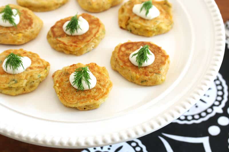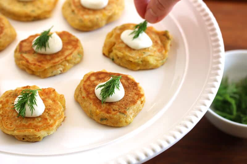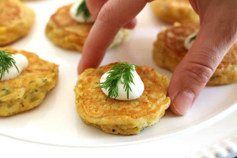 If serving as hors d’oeuvres, arrange the mini corn cakes on a serving platter with a dollop of creme fraiche (or sour cream) and a sprig of fresh dill.