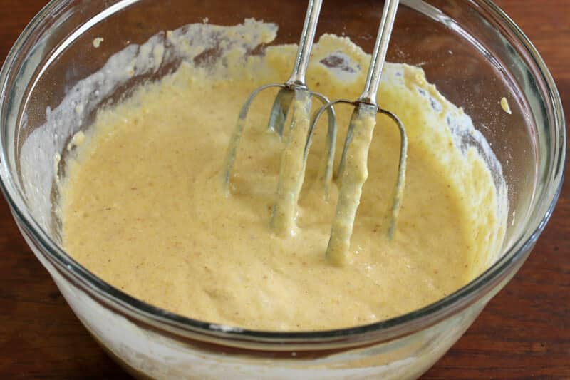 Add the buttermilk, eggs and butter and beat just until combined.