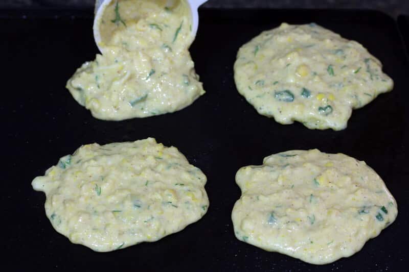 Heat a griddle to medium-high heat and lightly spray with cooking oil. Scoop heaping tablespoons onto the griddle (1/4 cup if you’re making full-sized corn cakes) and cook on each side until golden brown.
