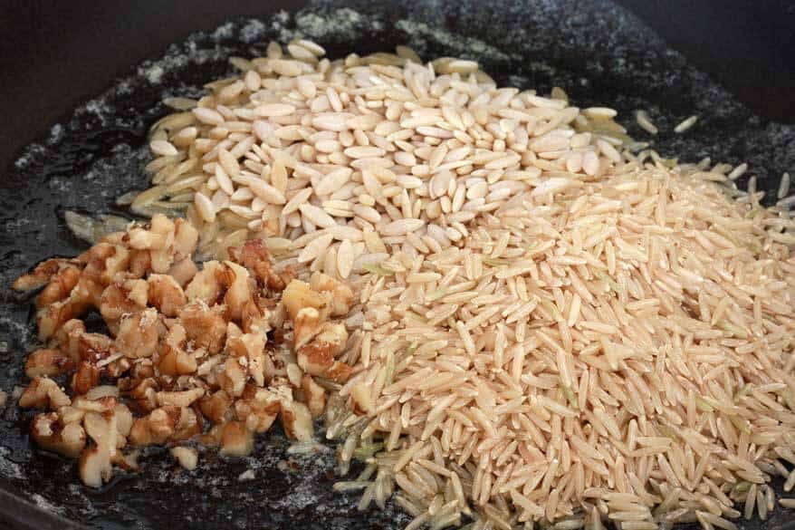 Melt the butter and olive oil in a skillet and add the rice, orzo and chopped walnuts.