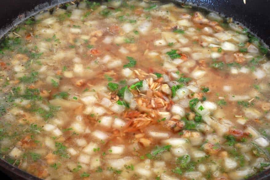 Saute until roughly half of the rice and orzo is browned.