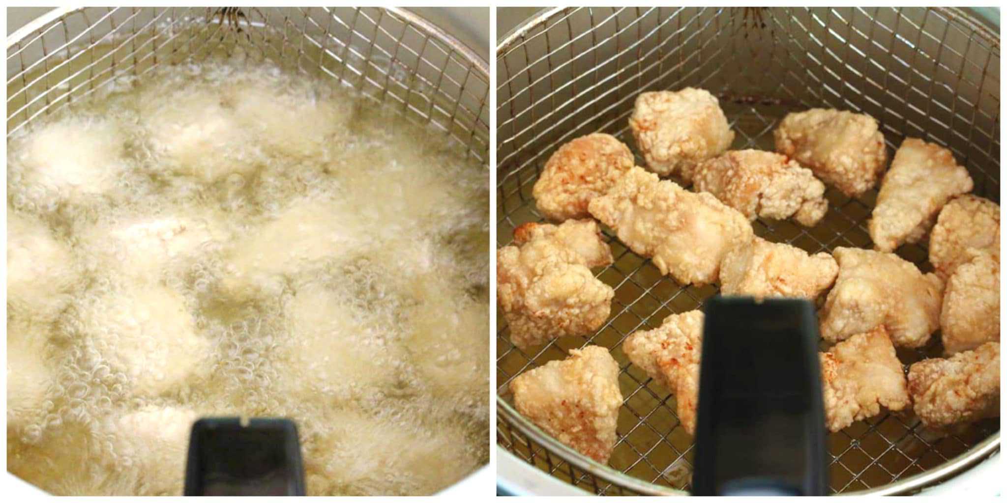 Working in batches and being careful not to overcrowd the deep fryer, fry the chicken until golden brown and crispy.