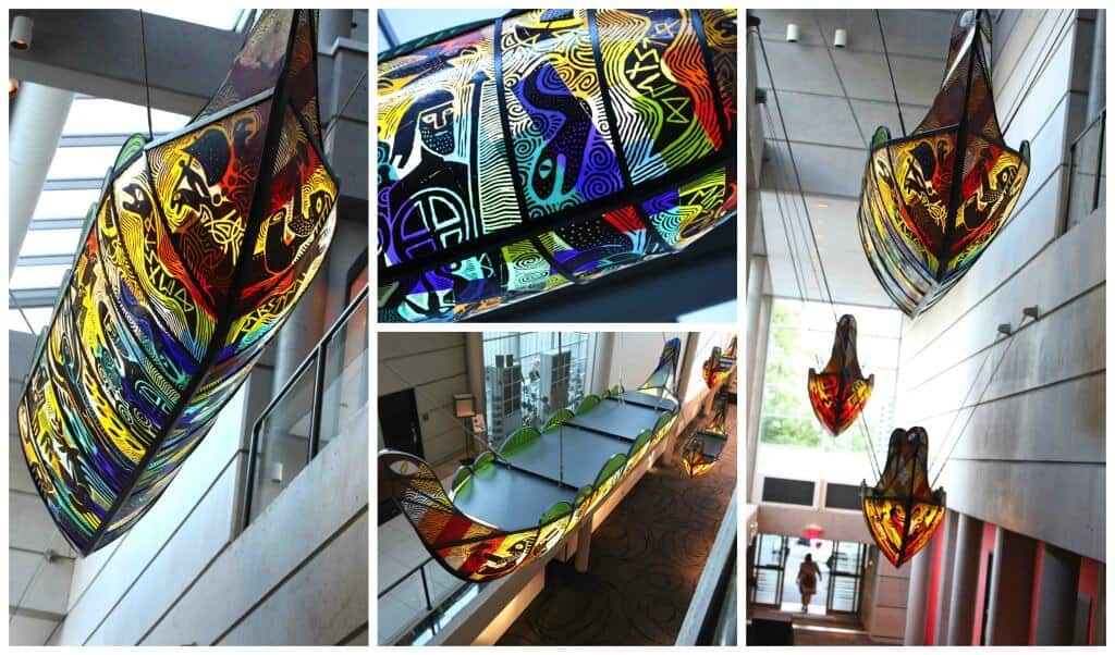 Suspended high in the air above the Grand Corridor are three giant, stunning Viking boats created by Danish artist Vibeke Skov. The stained glass ships depict the Norse creation myths.