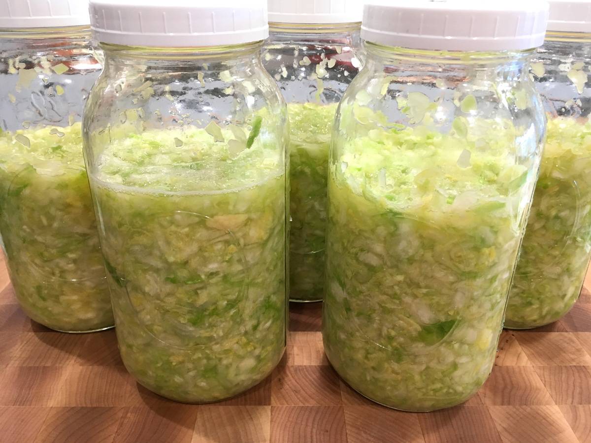 Once your sauerkraut has reached the level of tanginess that you want, it’s time to screw the lid on tight (remove the airlock lid if using and replace it with a regular lid).