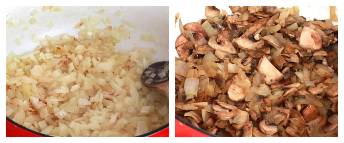 - In a heavy pot or Dutch oven, melt 2 tablespoons of butter. Add the onions and cook until translucent and just barely beginning to brown. Add the garlic and cook for another minute. Add the mushrooms and cook for 5-7 minutes until the mushrooms release their juices. Transfer the mushroom mixture to a bowl and set aside.