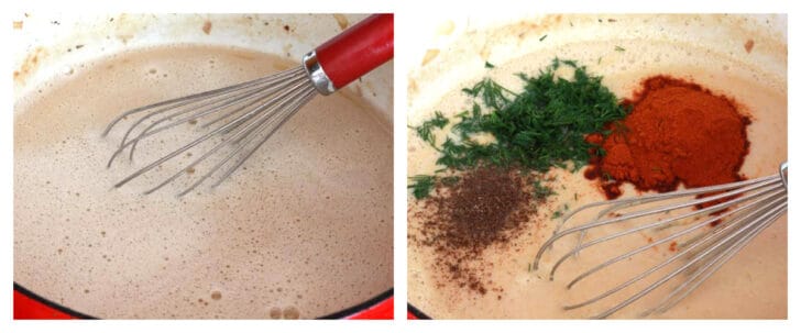 First we take onions and cremini mushrooms and caramelize them in butter. Then a separate rich roux is prepared with butter and flour which adds a world of depth and flavor to the soup. A generous amount of paprika is added along with the delicate flavor of dill and a “surprise” dose of umami in the form of tamari. The end result is a velvety-smooth, luxuriously flavorful, show-stopping soup that will make you and your dinner guests swoon with delight!