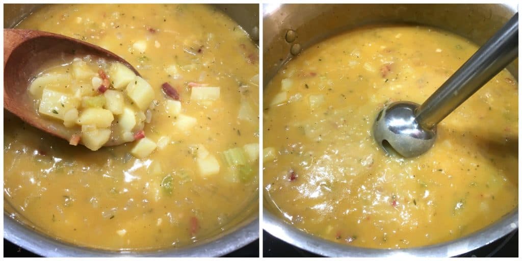 The consistency is right when the potatoes are so soft that some have begun to fall apart. If you prefer the chowder to be thicker or less chunky, use an immersion blender (or transfer 1 cup of the chowder to a blender) puree just a small portion of it.