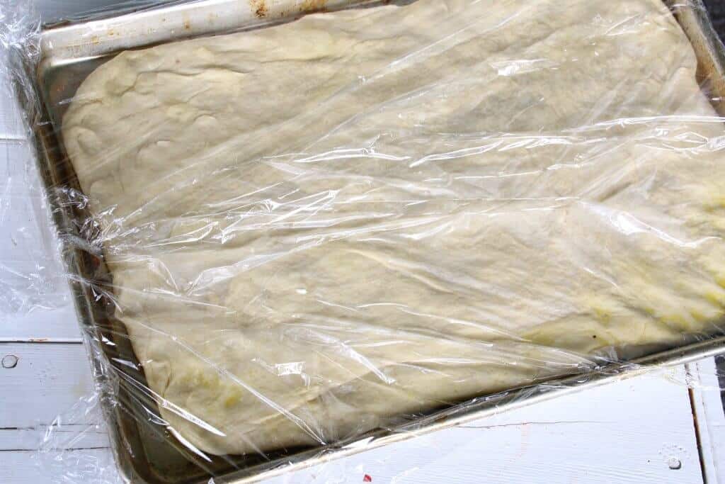 - Coat a standard 15 1/2 x 10 ยฝ-inch rimmed sheet pan with the 1/4 cup of olive oil. Place the dough on the sheet pan, pulling and pressing it with your hands it to spread it across to fit the size of the pan. Cover loosely with plastic wrap and let the dough rise for another 60 minutes or until doubled in size. Towards the end, preheat the oven to 425 degrees F.