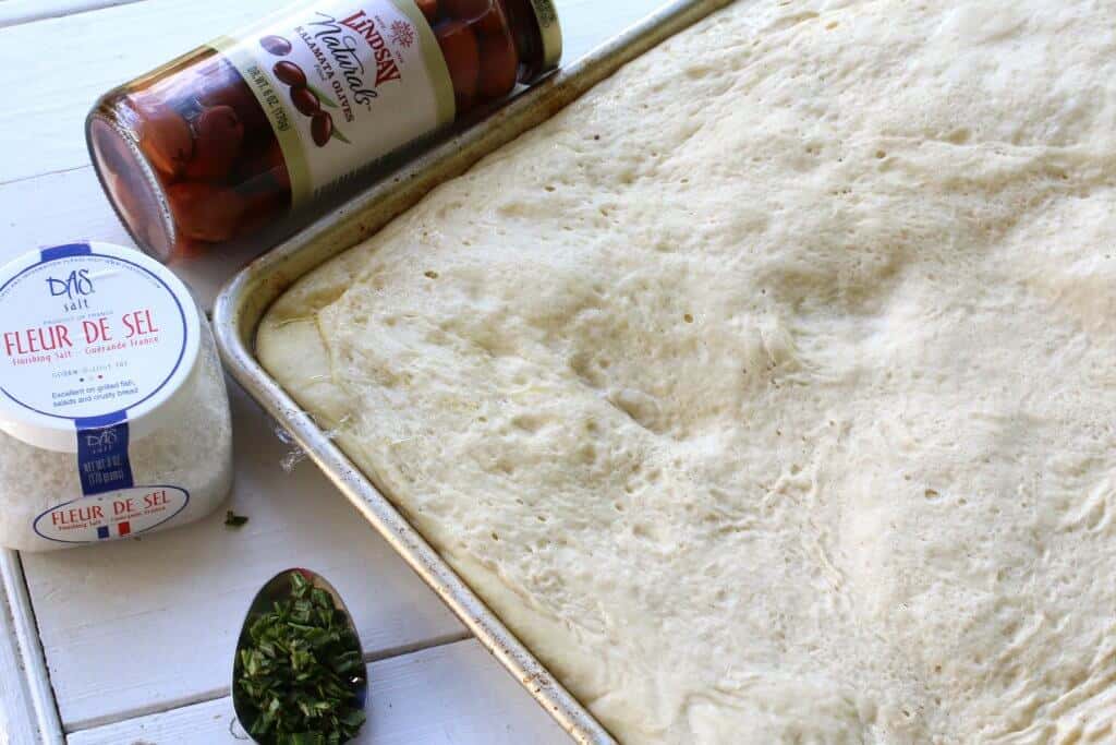 I’m going to make this focaccia using olives and rosemary for a phenomenal Olive Rosemary Focaccia but you can use any toppings of your choice.