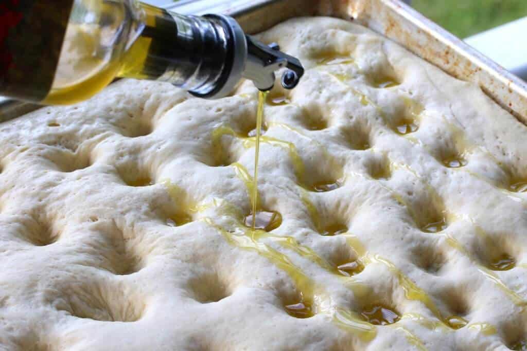 Be generous. Remember, focaccia is also known as “olive oil bread” and that is key to achieving the right texture and consistency.