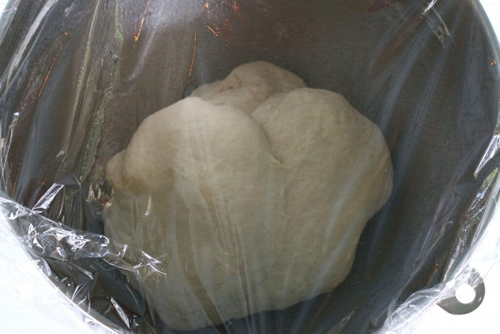 - Remove the dough, spray the mixer bowl with olive oil, return the dough, cover the bowl loosely with plastic wrap and put it in a warm, draft-free place to rise for at least 1 hour or until doubled in size.