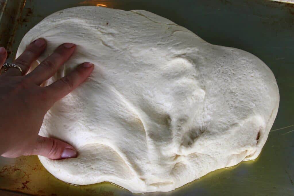 Place the dough on the oiled sheet pan, pulling and pressing it with your hands it to spread it across to fit the size of the pan.