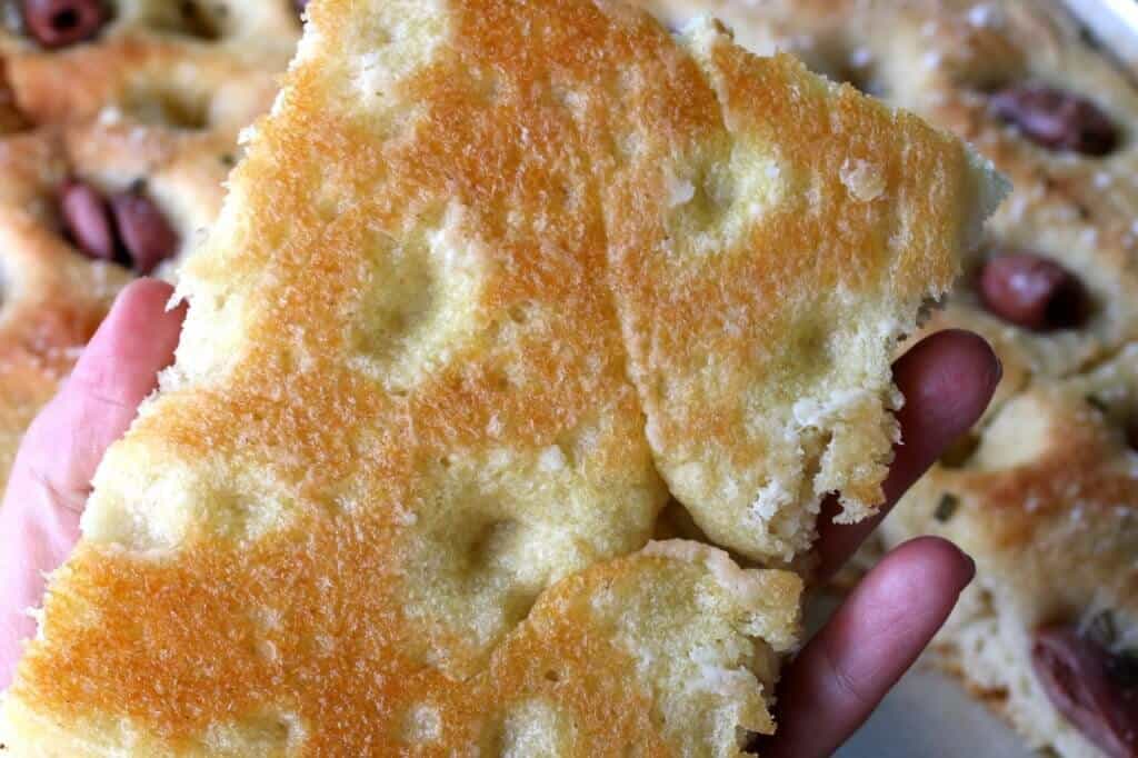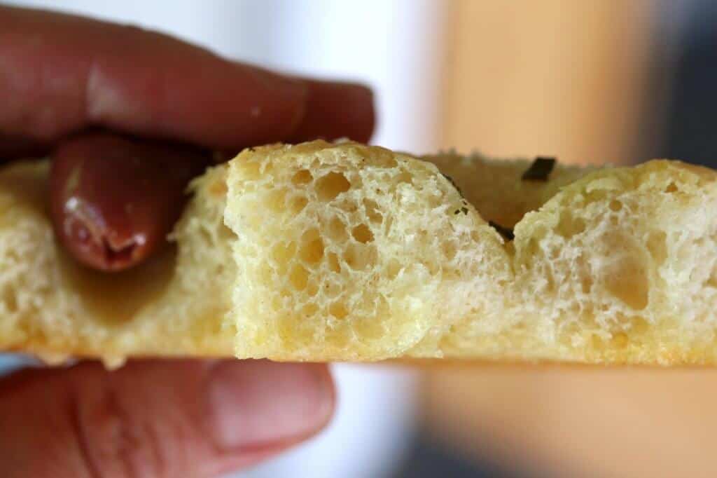 See the air pockets throughout the interior of the bread? The end result is a focaccia with a crispy exterior and a lightly moist and chewy interior. It’s pure heaven!
