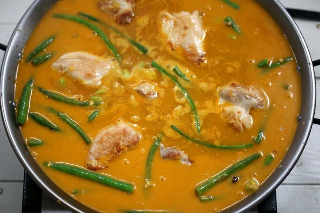 - Position the beans the way you’d like them to appear in the final dish. Pour the paello broth into the pan. Remember the cardinal rule: DO NOT STIR. Once the mixture begins to bubble, position the chicken pieces in the pan followed by the artichokes and then top with the Piquillo peppers. Place some sprigs of rosemary on top.
