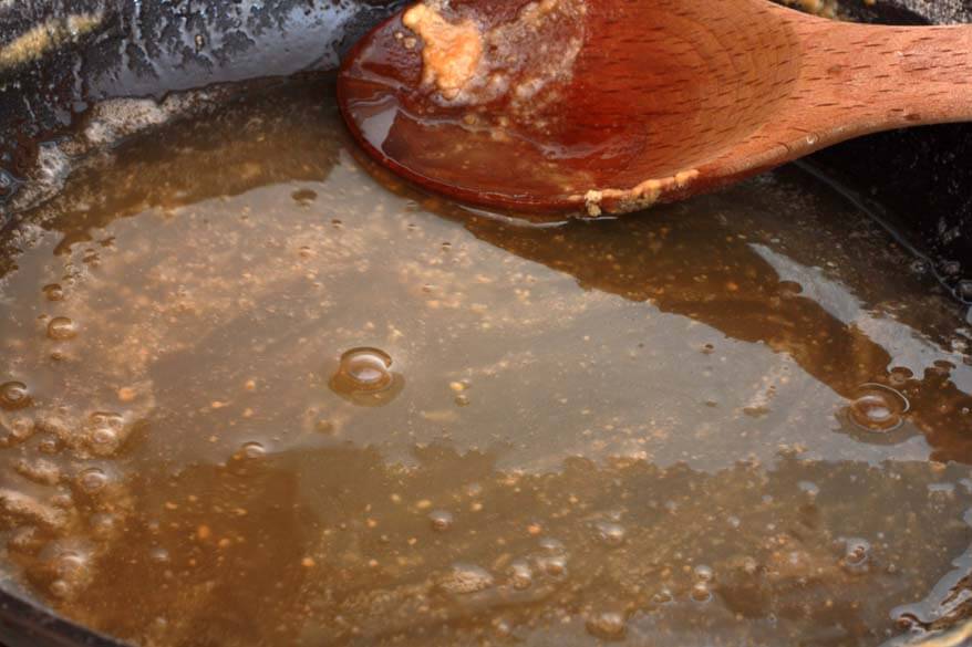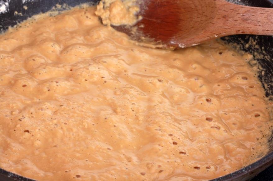Return the flour mixture to the skillet and stir it into the sugar mixture. ย Return the mixture to a simmer for another 3-4 minutes.