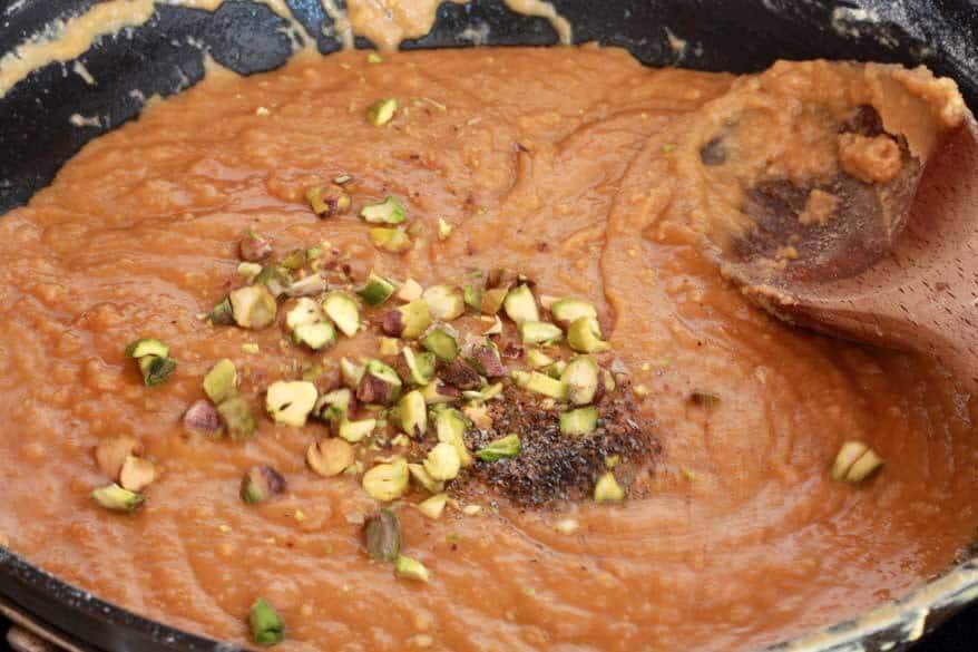 - Add the sugar and water to the same skillet. Bring to a simmer and stir frequently for about 5 minutes until the mixture is syrupy. You'll know the syrup is ready if it passes the "two thread" test: Take some of the mixture between your thumb and index fingers (blow it first to cool it a little!) and if two threads form when you pull your fingers apart, it's ready.Return the flour mixture to the skillet and stir it into the sugar mixture. Return the mixture to a simmer for another 3-4 minutes. Stir in the cardamom and pistachios.