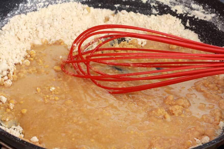 - Place the chickpea flour in a non-stick skillet over medium-high heat and stir constantly for 3-4 minutes until toasted - it will only very slightly darken in color. Whisk in the ghee or butter. The mixture will be clumpy and on the dry side initially. Continue to stir and the ghee or butter will begin to separate from the flour and become more liquidy. Continue to stir constantly as the mixture simmer and darkens in color, about 3-4 minutes. Think of this process like making a roux for a gravy or sauce. Pour the mixture into a bowl and set aside.