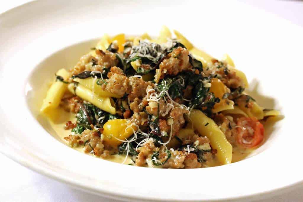 I ordered the Garganelli con Salsiccia and I thought I had died and gone to culinary heaven. Hand-rolled pasta with Italian sausage, parmigiana cream sauce, Swiss chard and cherry tomatoes. The flavors were so rich and vibrant, they had my taste buds completely captivated. My husband was equally wowed. If I lived in the area, this is a dish I would come back for again and again. Along with that Cocomero salad.