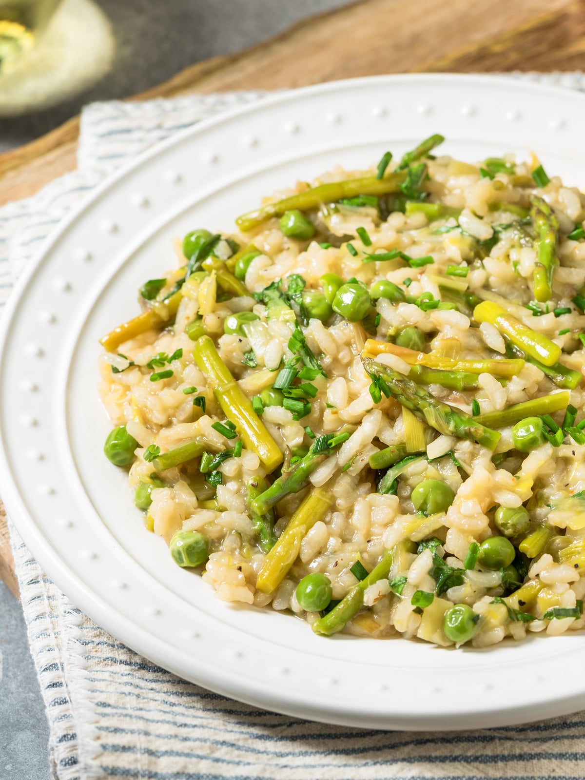 - Heat the olive oil and butter in a medium Dutch oven or high-sided skillet over medium heat. Add the leek and cook until tender, 5-6 minutes. Add the garlic and cook for another minute. Stir in the rice and cook for a minute, ensuring the grains are coated in oil. Stir in the wine and cook for a minute or two until it's mostly evaporated. Pour in one cup of the broth along with the salt. Bring to a very low and gentle simmer, stirring constantly, until the rice has absorbed the broth. Add another cup of broth and repeat the process, adding one cup of broth at a time, ensuring the rice has absorbed the liquid before adding the next cup of broth. Add the asparagus and green peas with the 5th and final cup of broth, letting it simmer until the asparagus is tender but with some bite. The rice should likewise be tender but not mushy. Remove the risotto from the heat and stir in the butter, Parmesan cheese and lemon juice. If you prefer a slightly soupier consistency, add a little more broth. Add salt to taste. Serve immediately sprinkled with some chopped chives or parsley and some additional grated Parmesan if desired. Serves 4 as a main dish or 6 as a side dish.