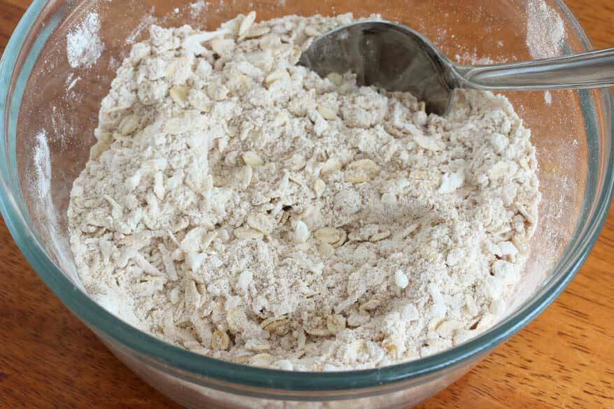 To prepare the crumble, in a separate bowl add the flour, oats, coconut, brown sugar, flaked coconut, cinnamon, and salt.