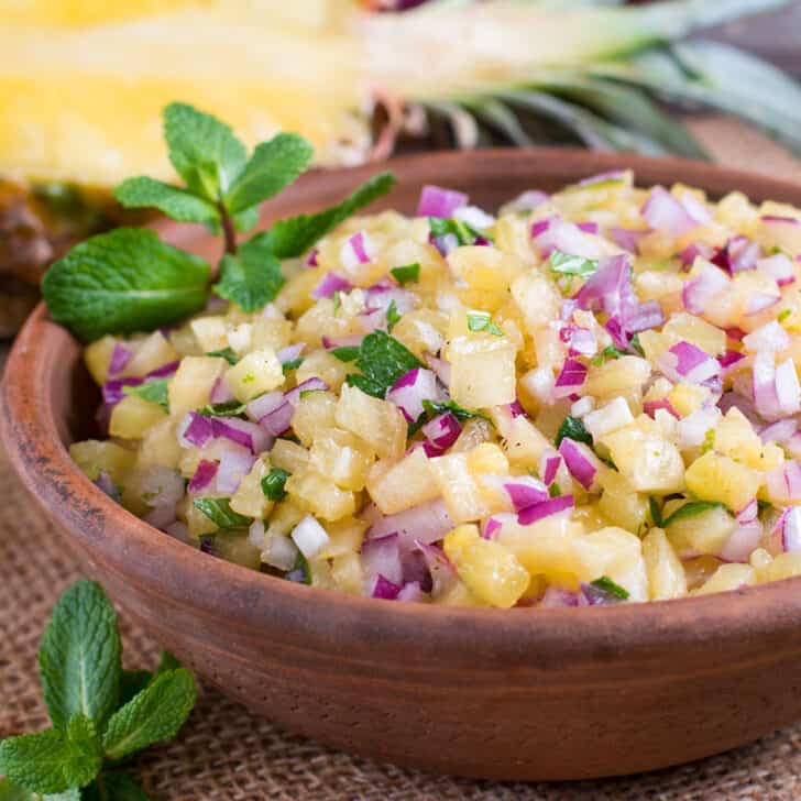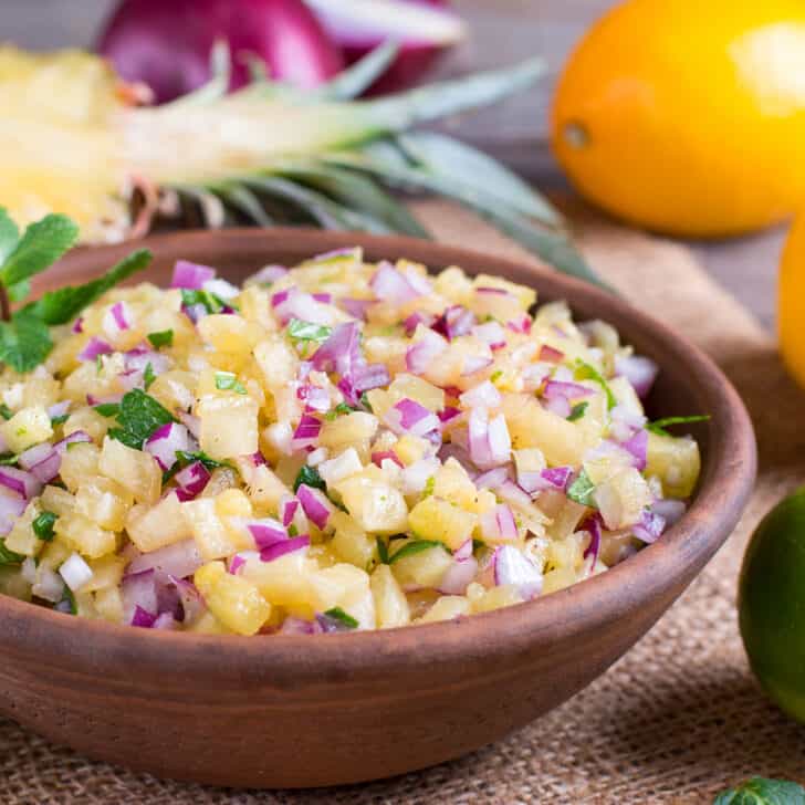 A fun variation on traditional tomato salsa, this pineapple salsa is a burst of sweet sunshine!ย The Meyer lemon and mint add irresistible freshness and flavor.ย This pineapple salsa pairs deliciously with a wide variety of dishes and is simply scrumptious with a bag of tortilla chips – just ask my daughter.