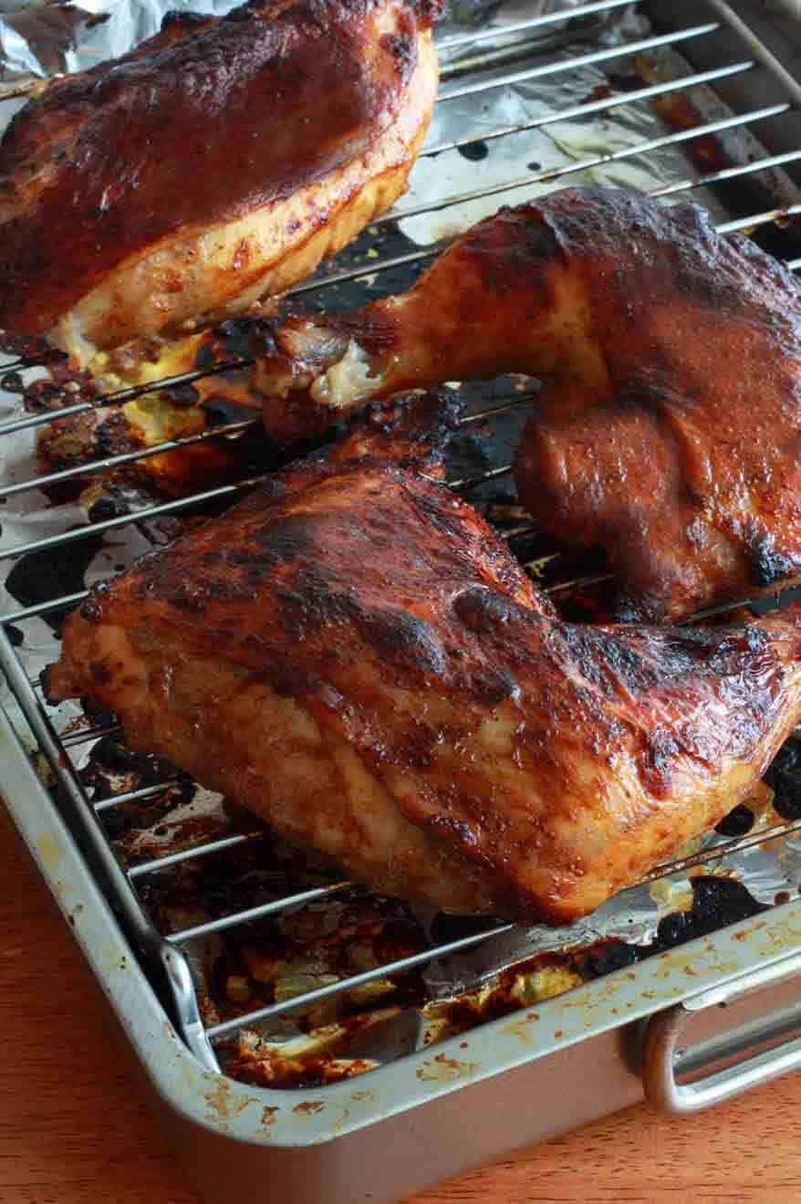The marinade is enough for one whole chicken (you can either roast it whole or cut it in pieces). But you can use whatever bone-in/skin-on chicken pieces you want. This time I just used two leg quarters and a breast.
