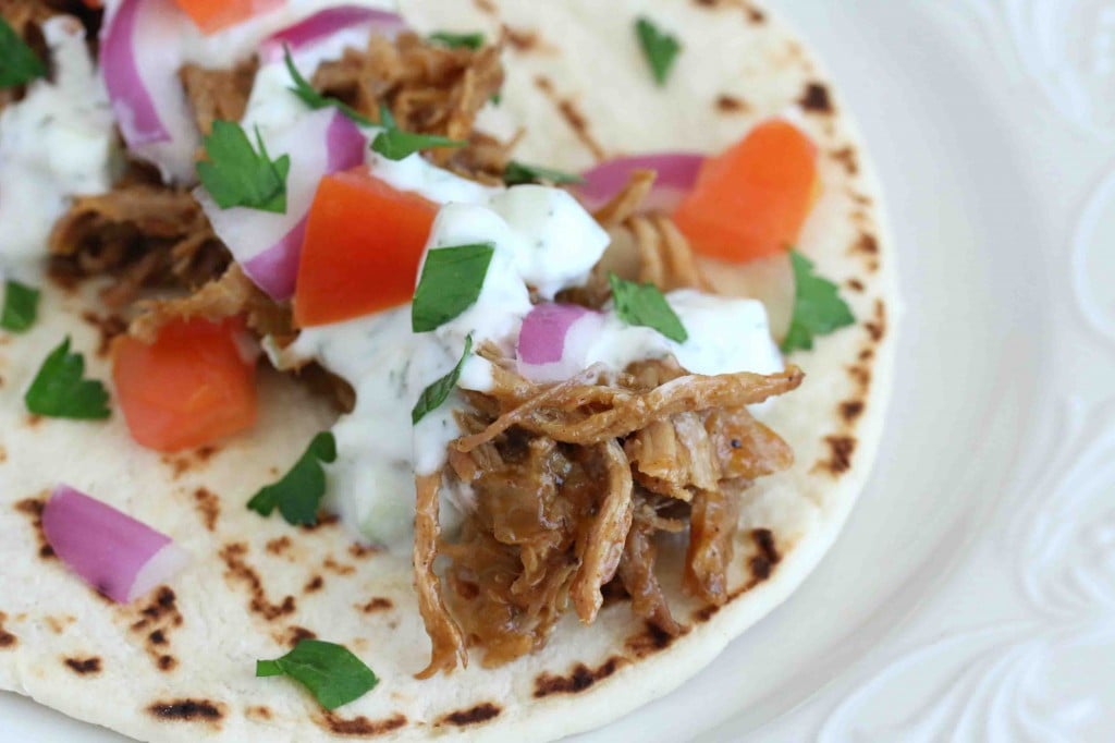 This recipe was developed very spontaneously. ย It was one of those days where you just don’t feel like cooking (yes, even food bloggers have those moments). ย I had a frozen pork roast that was screaming to be used and so I threw it in the slow cooker with some chopped onions (that’s always a great place to start, right?). ย I wasn’t sure yet where I was going with it and turned the setting to LOW while I gathered up the 267 (that’s how it felt anyway) tiny plastic toy animals my 4 year old son had scattered throughout the kitchen drawers and cabinets (like I said, it was one of those days.) ย As I reached for the aardvark wedged between two pots inspiration struck: ย Just grind up a batch of my Greek Seasoning Blend and throw it in with the pork. ย It’ll be gyros…pulled pork style. ย I unwedged the aardvark, added it to the heap of rescued animals, then quickly whipped up the Greek seasoning, a quick tzatziki sauce, and the slow cooker did the rest.