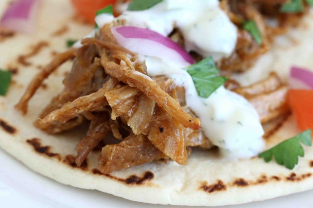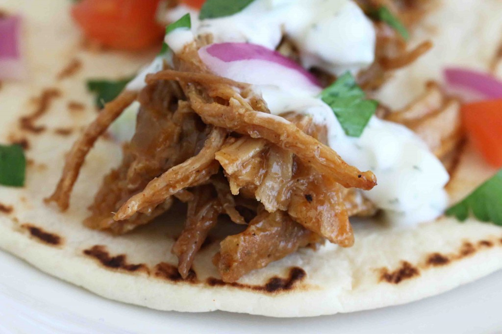 Shred the pork on a plate with two forks. ย Return it to the slow cooker and let simmer for a few more minutes to allow the juices to absorb into the shredded meat. Taste and add more Greek seasoning if desired (if adding more, let it cook a few more minutes).