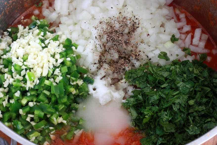 - Bring a large pot of water to a rapid boil. Carefully drop the tomatoes in the boiling water for 30 seconds them remove. Peel the skins and squeeze the tomatoes to remove the seeds along with excess liquid Place the tomatoes in a colander to drain. Chop the tomatoes.Place the tomatoes in a large stock pot along with the vinegar. Add all remaining ingredients. Stir to combine, bring to a boil, reduce the heat to medium and simmer uncovered for 10 minutes.