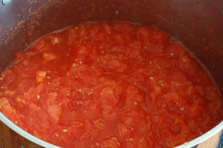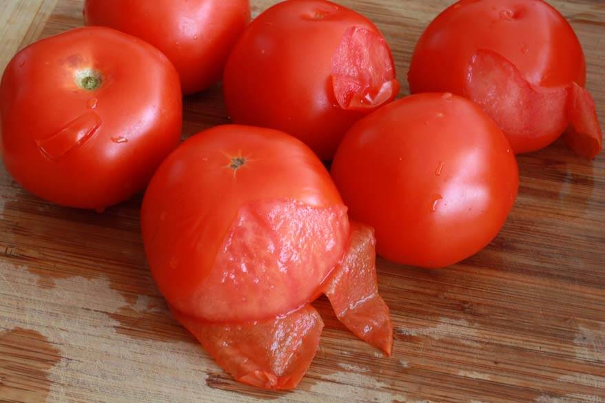 The best way to peel tomatoes is to get a large pot of water boiling and then place the tomatoes in the boiling water for 30 seconds. ย (Some suggest placing them in ice water next, but that isn’t necessary for this recipe) ย When you remove the tomatoes from the boiling water their skins will start to split (you may need to assist them by piercing them with the tip of a knife) and they can then be easily peeled.