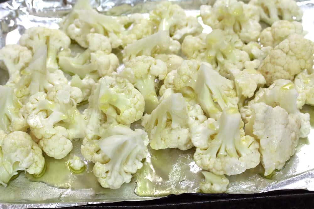 - Preheat the oven to 400 degrees F.Place the cauliflower florets onto a lined baking sheet and drizzle with the olive oil and a pinch of salt. Roast for 20-25 minutes until nicely browned, turning with a spatula after 15 minutes. Set aside until ready to use.