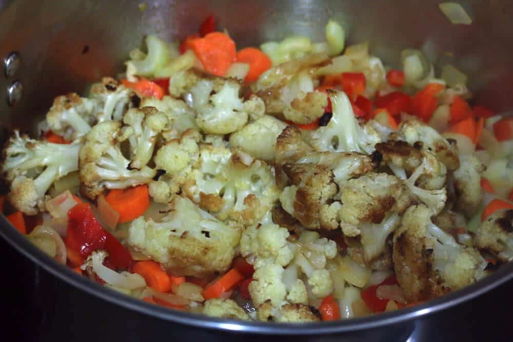 Add the roasted cauliflower. Add the stock, thyme, bay leaf, salt and pepper and bring to a boil. Reduce the heat to medium-low, cover and simmer for 20-25 minutes. Discard the bay leaf.