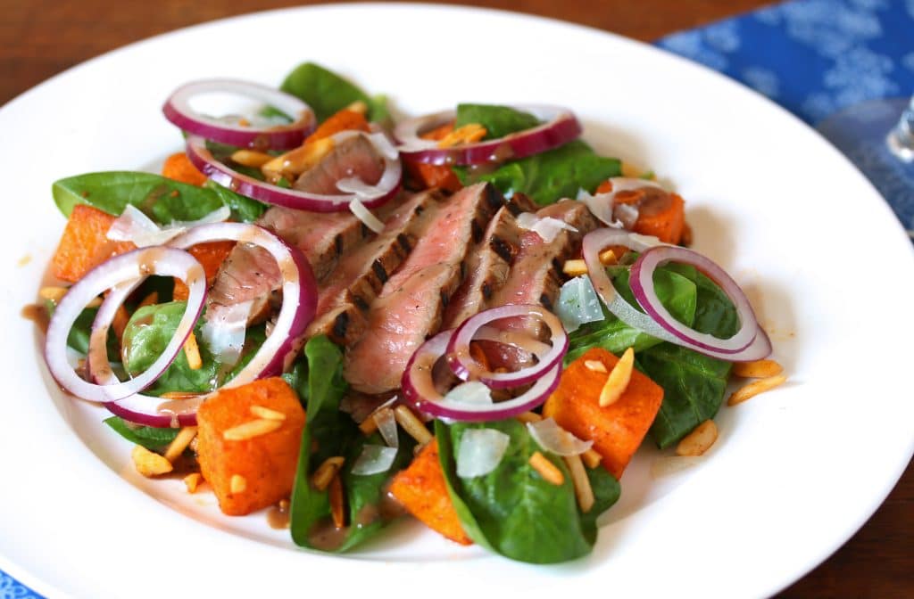 Here is a deliciously satisfying salad that features tender steak, crispy spinach and red onions, crunchy almonds, roasted butternut squash seasoned with aromatic spices and served with a balsamic vinaigrette and shaved Parmesan.