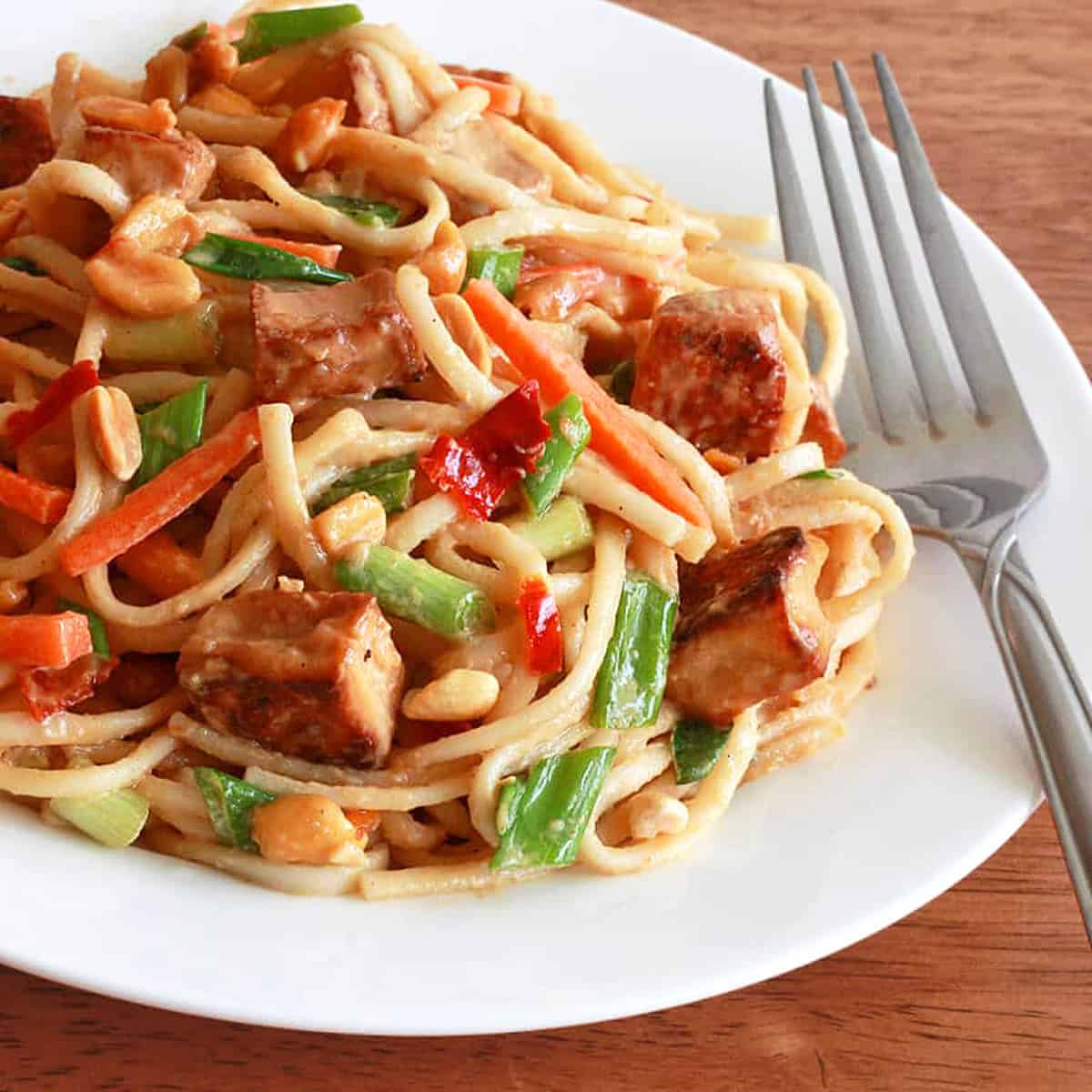A delicious Thai peanut sauce is combined with veggies and tossed with noodles and either baked tofu for a vegetarian and vegan dish or chicken breast.ย This Thai Peanut Noodles dish is quick and easy to make and is sure to be a hit!