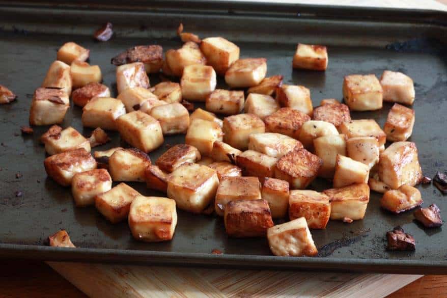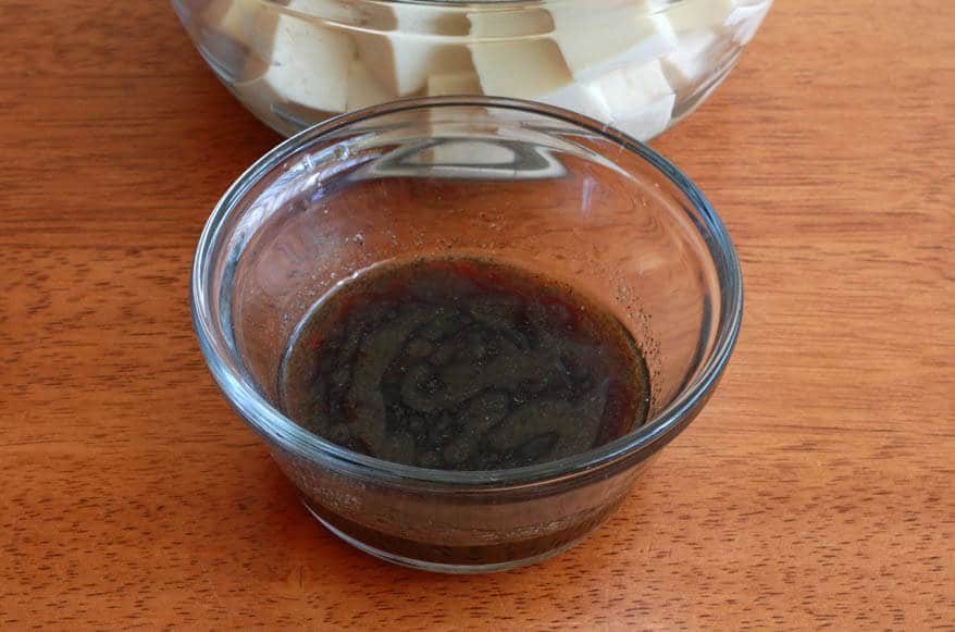 Pour the marinade evenly over the tofu cubes and let marinate for at least 20 minutes.