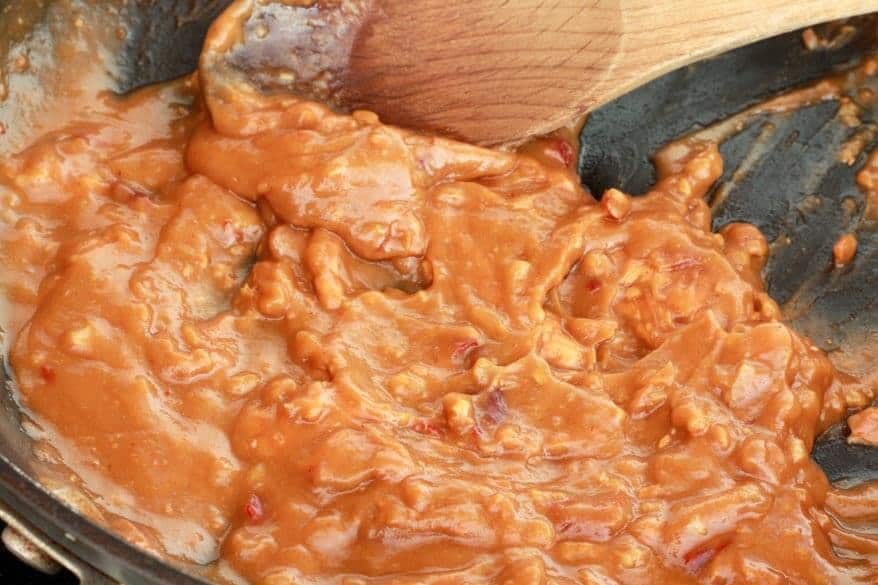Add the broth to the peanut sauce to thin it out and simmer for another minutes.